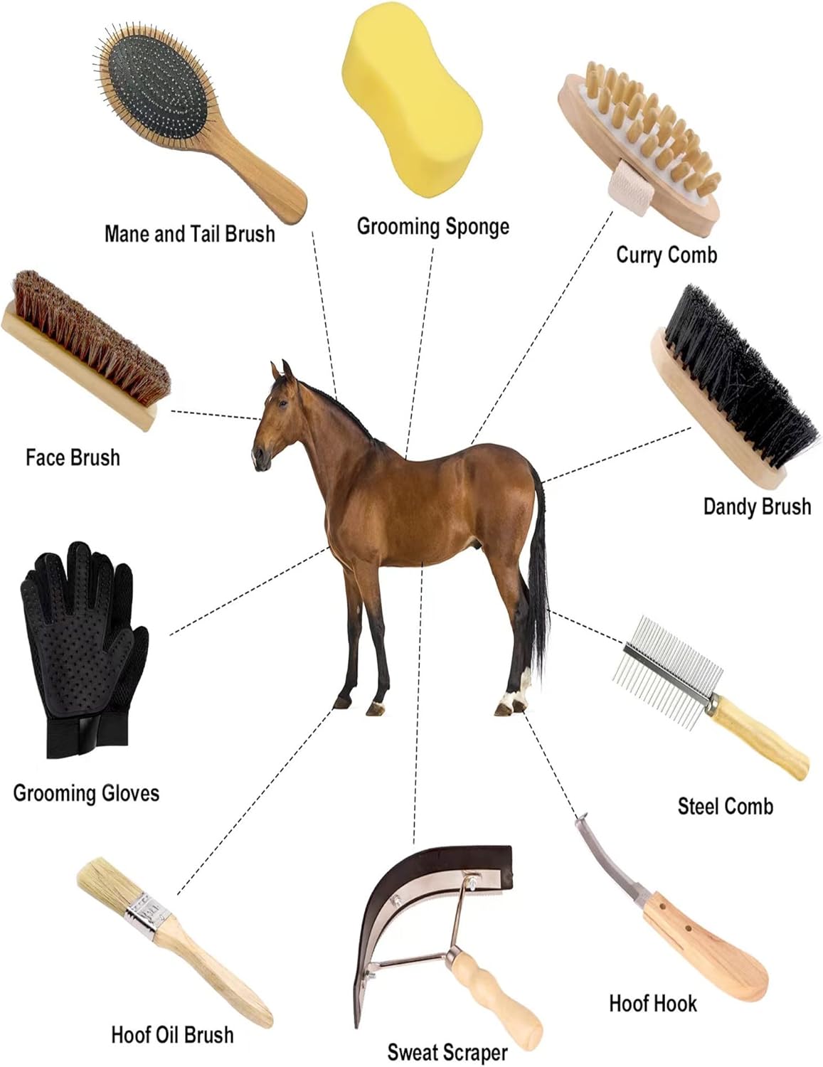 ♞【Package contains】You will get a set of professional horse grooming set,Face Brush,Mane and Tail Brush,Grooming Sponge,Dandy Brush,soft finishing brush,Curry Comb,Steel Comb,Hoof Pick with brush,Sweat Scraper,Grooming Glove and Grooming bag.