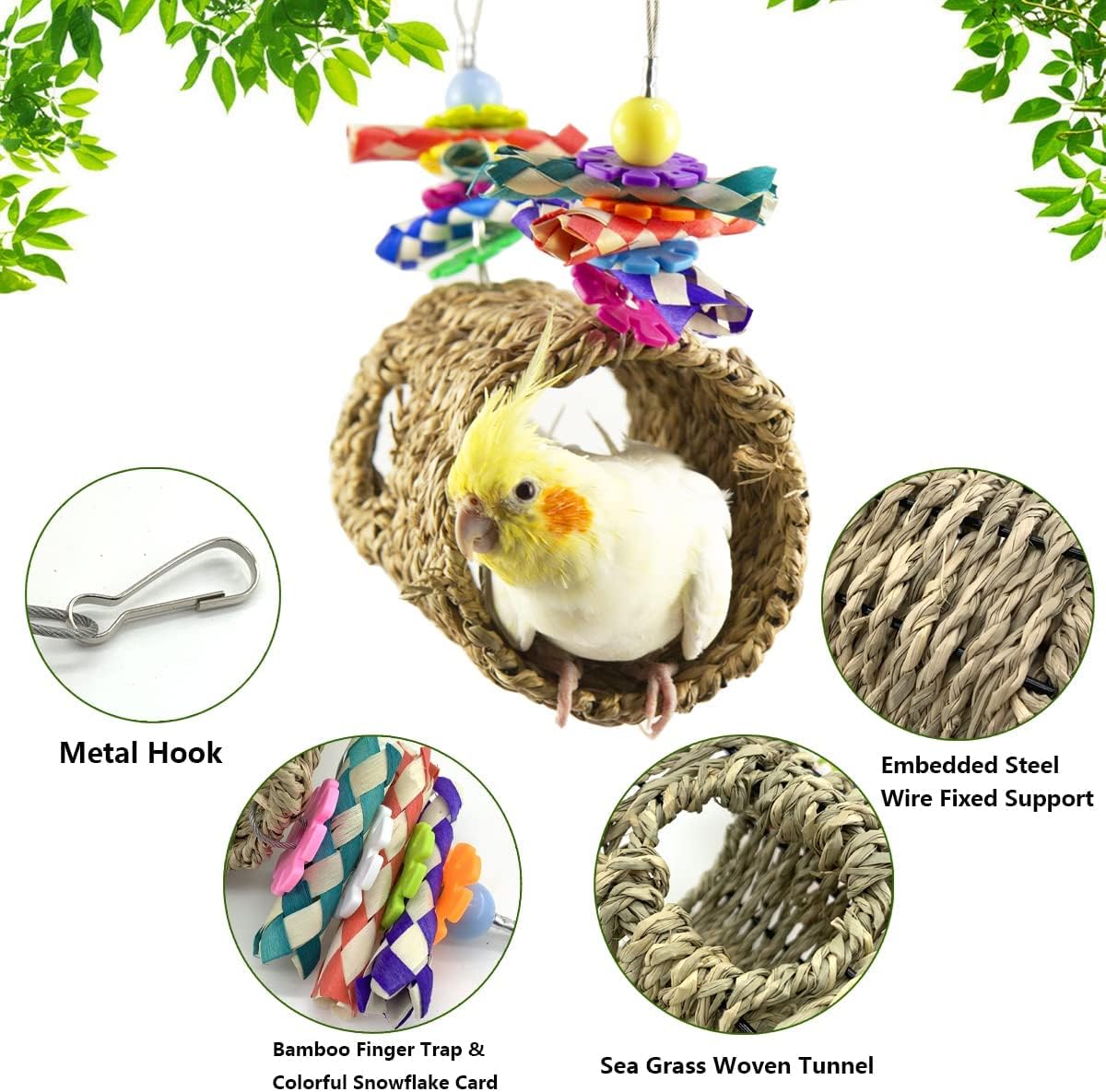 The bird sheltering hideout is hand-woven from seagrass that are chewable, decorated with bamboo woven straws and snowflake brick.