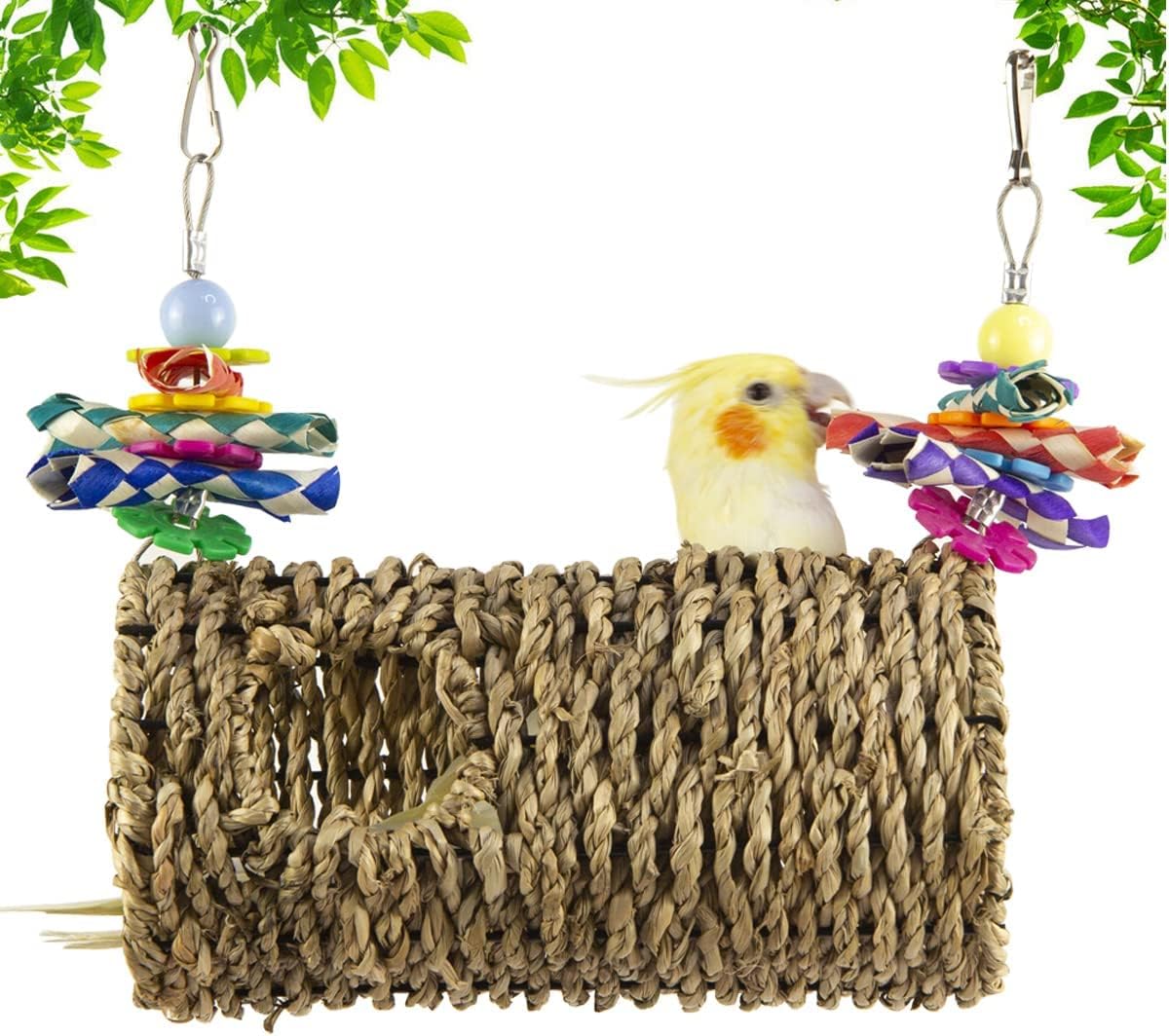 【Excellent Material】The bird toy is handcrafted with natural seagrass, decorated with colorful bamboo straws, and supported by iron wire. Your bird can safely chew or peck. A great place for parrots to swing or rest on a swing.
